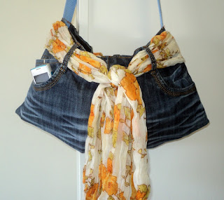 No início eram umas calças velhas , prestes a serem desmanchadas a fim de aproveitar os bocados para limpeza dos pincéis. Depois encontrei numa gaveta um cachecol que me tinham oferecido há 3 ou 4 anos, mas que nunca usei, porque é peça que nunca uso. (Acho que só ficam bem a quem tem pescoço de cisne e não é o meu caso) Juntei as duas peças e a ideia nasceu. E com umas tesouradas e uns minutos na máquina de costura, ganhei uma mala nova.