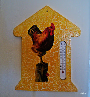 Para alegrar e dar mais cor à cozinha. Um termómetro de madeira pintado e com um galo na técnica do guardanapo